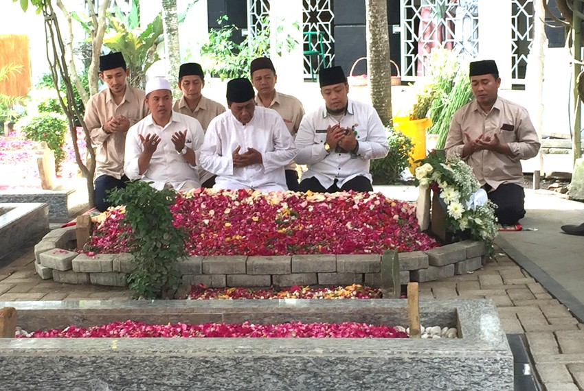 ZIARAH KUBUR: Rombongan penerus Masjid Nasional Al Akbar Surabaya, berdoa di makam Gus Sholah, Jombang, Selasa (4/2). (ADI WIJAYA/JAWA POS)