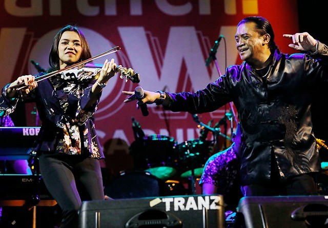 PENGALAMAN BERHARGA: Sandy Ria Ervinna (kiri) mengiringi Didi Kempot saat tampil di DBL Graha Pena Surabaya pada 9 Desember tahun lalu. (Puguh Sujiatmiko/Jawa Pos)