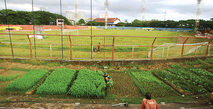 Di sisi lapangan ada tanaman kacang, sawi putih, kangkung, hingga mentimun. Yang dibatasi oleh tribun penonton dan pagar pembatas lapangan. Seandainya masih hidup, Ramang –sang legenda Makassar– pahlawan Indonesia saat menahan Uni Soviet 0-0 pada Olimpiade 1956, mungkin akan menangis.