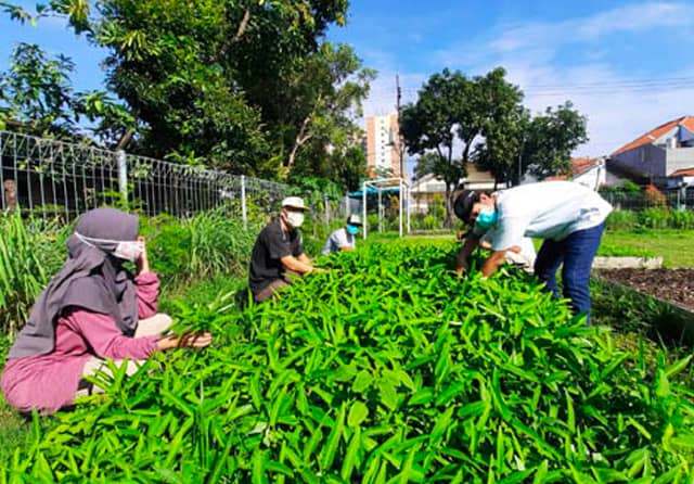 Ibu-ibu tampak bersemangat memanen kangkung dari salah satu petak blok tanaman di gazebo RW 3, Kelurahan Rungkut Menanggal, Kecamatan Gunung Anyar. Anak-anak dan bapak-bapak pun turut antusias memilah dedaunan hijau itu. Layaknya di agrowisata, tanaman tersebut tidak kalah segarnya.