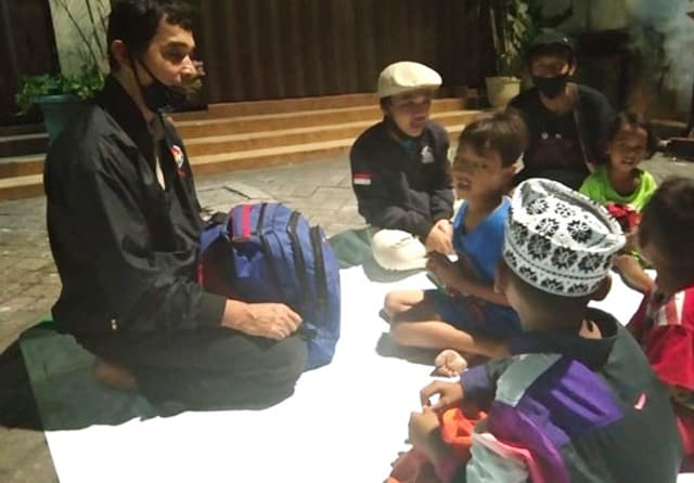 Mengenakan pakaian serbahitam serta menggendong tas, Luki Darmawan tiba di Jalan KH Mas Mansyur, Pabean Cantian, pukul 19.10, Senin (17/8). Kepala Rumah Pintar Matahari tersebut datang bersama empat relawannya. Belasan anak berusia 3 hingga 10 tahun menyambutnya dengan gembira.