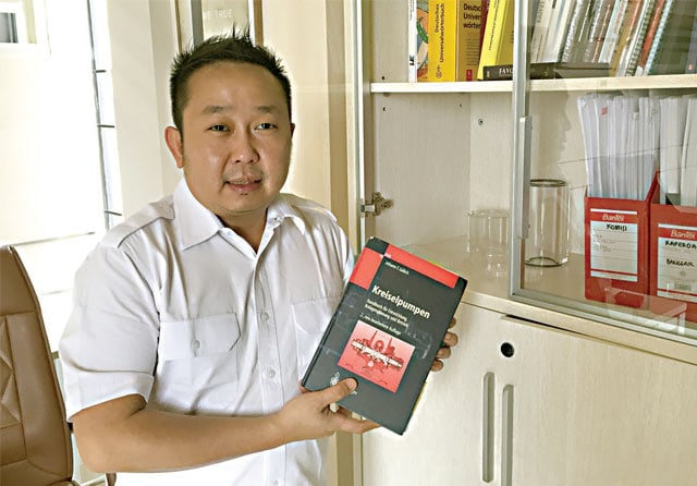SUMBER INSPIRASI: William menunjukkan buku bacaan berbahasa Jerman di lemarinya yang dia sebut sebagai primbon mekanikal. (Adi Wijaya/Jawa Pos)