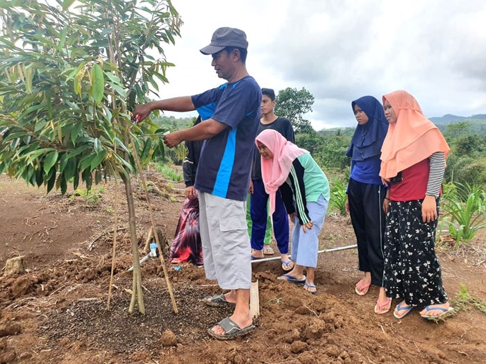 Dia berinovasi dengan berkebun model tumpang sari. Kebunnya seluas sekitar 2 hektare ditanami durian, pohon pandan duri sebagai bahan baku kerajinan tikar, dan kencur.