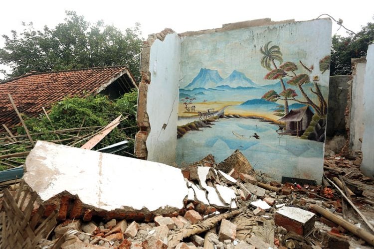 Yang temboknya sudah hancur. Atapnya bolong di sana sini. Terasnya juga berantakan. Di salah satu rumah potret aktor dan pembawa acara Indra Bruggman serta penyanyi Nike Ardilla tersenyum manis ”menyapa” siapa saja yang datang.