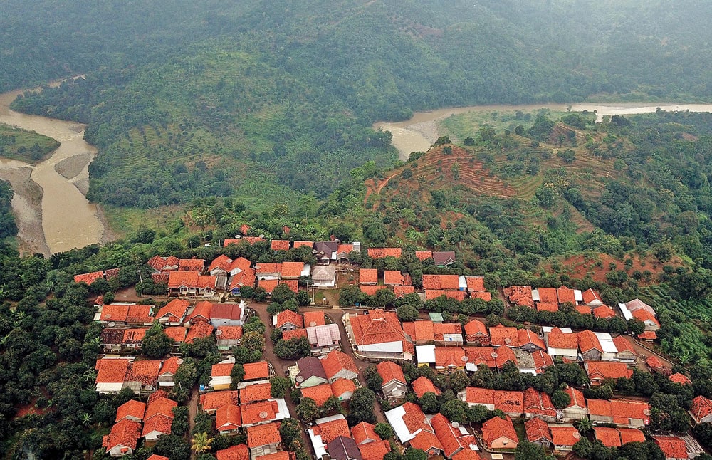 TEMPAT RELOKASI: Foto udara bangunan rumah warga di Dusun Buah Lega, Desa Sidamukti, Kecamatan Majalengka, Jawa barat. Di dusun itu ratusan warga Tarikolot sekarang bermukim. (SALMAN TOYIBI/JAWA POS)