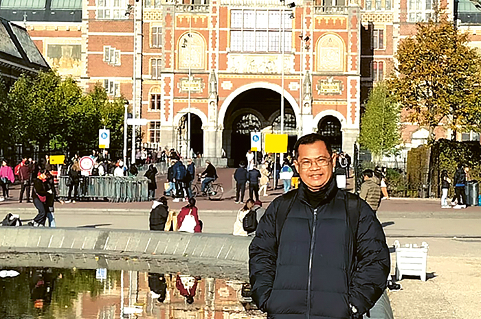 GEDUNG BERSEJARAH: Dekan Fakultas Ilmu Budaya (FIB) Unair Purnawan Basundoro berfoto di depan gedung Rijksmuseum di Amsterdam awal Oktober lalu.