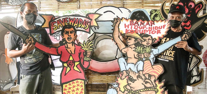 Satu berupa seorang emak membawa pisau dan padi dengan pita bertulis Save Wadas. Satu lagi sepasang petani dengan gaman yang menduduki babi terikat di atas pundi bertulis korupsi. ”Kami keluarin wayang tentang itu untuk contoh bahwa saat ini ada isu yang menyangkut hidup orang banyak,” ungkap Yayak.