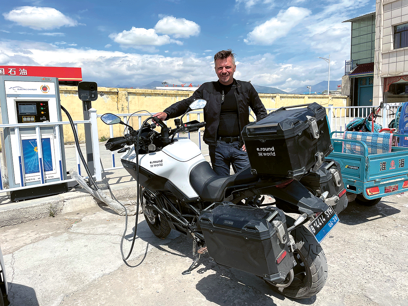 ISI DAYA: Roman dan motor listriknya di charging station di kawasan Tibet, Tiongkok, pada pertengahan Agustus 2023.