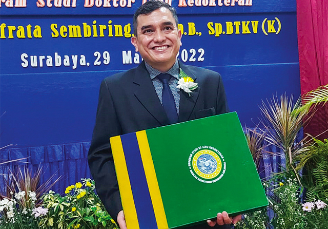 DOKTER Yan Efrata Sembiring SpB SpBTKV (K) begitu semangat memaparkan hasil temuannya tentang pembuluh darah saat sidang terbuka untuk mendapatkan gelar doktor di aula Fakultas Kedokteran (FK) Universitas Airlangga (Unair) Selasa (29/3). Di hadapan para promotor, laki-laki 47 tahun itu membuat inovasi prototipe graft pembuluh darah menggunakan arteri mesenterika sapi dengan teknik stem cell.