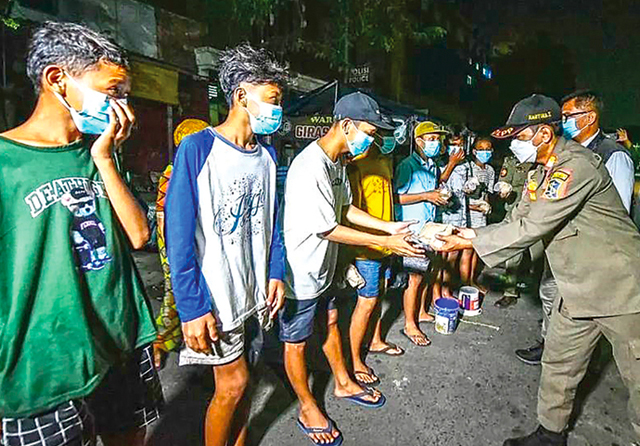 SAATNYA BEKERJA: Tim Asuhan Rembulan membagikan makanan sahur kepada warga. Tim tersebut bekerja setiap malam. (Umar Wirahadi/Jawa Pos)