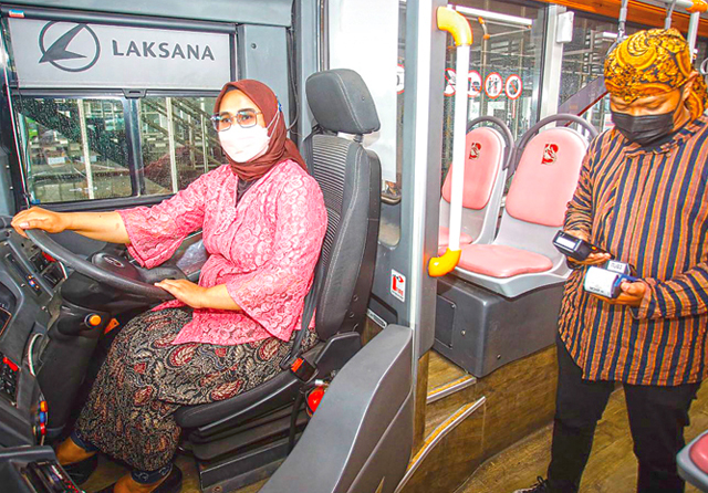 DRIVER KARTINI: Eka Hardianti Suteja mengemudikan Suroboyo Bus. Eka ingin perempuan bisa tampil di segala bidang. (Eka Hardianti untuk Jawa Pos)