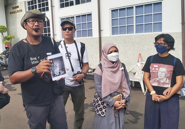 Sesekali tangannya membenarkan posisi mikrofon dan speaker kecil hitam yang kerap melorot saat berjalan. Itu dilakukan supaya suara yang keluar dari speaker kecil hitam itu terdengar jelas. Sehingga para peserta jalan-jalan yang ingin mengetahui masa lalu berbagai tempat bersejarah di ‘Kota Hujan’, memahami dengan seksama informasi yang disampaikan.