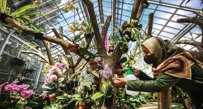 SPESIES DAN HIBRIDA: Pekerja melakukan perawatan anggrek di Griya Anggrek Kebun Raya Bogor (25/5). (MIFTAHULHAYAT/JAWA POS)
