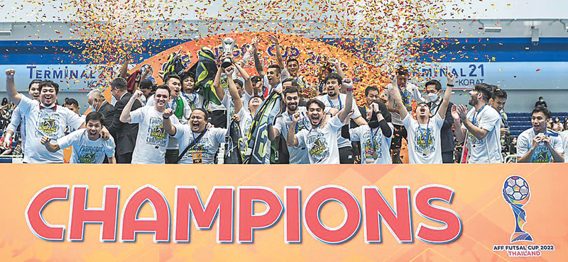 DOUBLE WINNERS: Selebrasi Bintang Timur Surabaya setelah menjuarai AFF Futsal Cup 2022 di Nakhon Ratchasima, Thailand. (BINTANG TIMUR SURABAYA FOR JAWA POS)