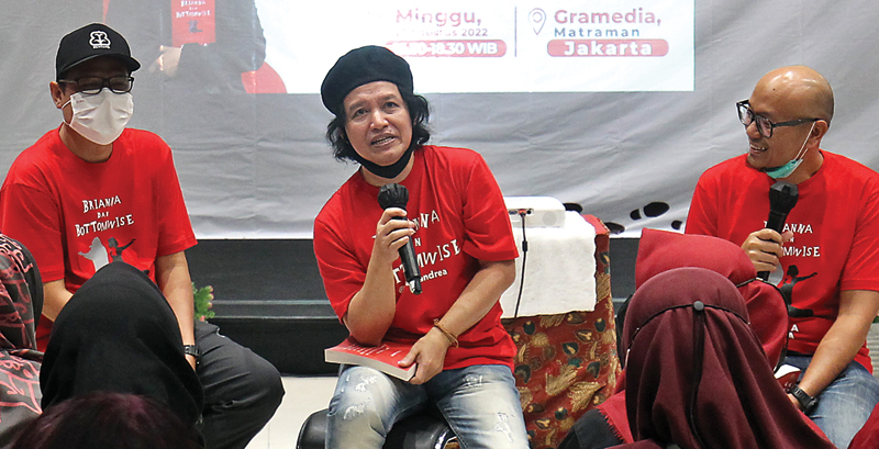 REHAT PANJANG: Andrea Hirata (tengah) saat peluncuran karya terbarunya,