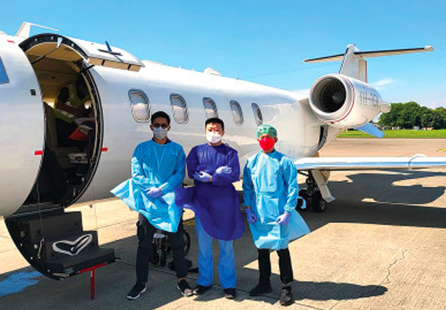 BANTU PASIEN: Dokter Eddie Andytama (tengah) bersama petugas saat mengantar pasien dari Jakarta ke Singapura dengan jet pribadi. (Dokter Eddie Andytama untuk Jawa Pos)