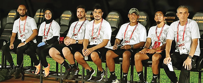 BIKIN BETAH: Hilda duduk bersama staf pelatih Borneo FC semasa masih ditangani Milomir Seslija. (Dok. Hilda Khoirun Nisa)