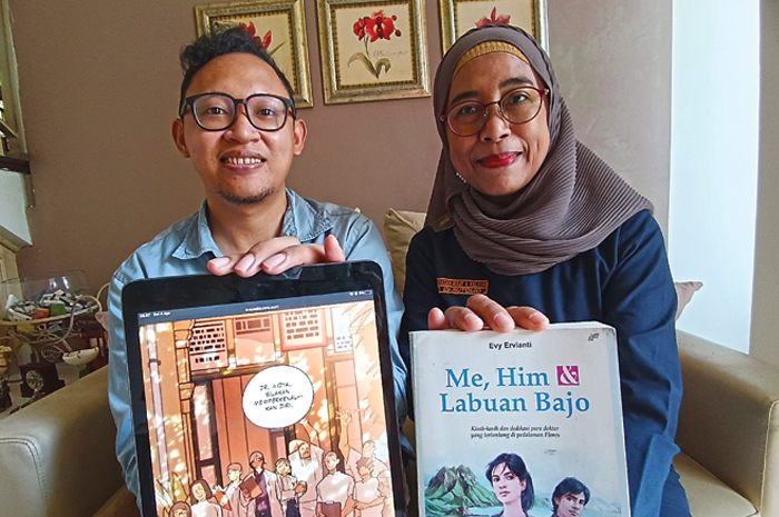 MENGHIDUPKAN NOVEL: Komikus Faiq AZ (kiri) bersama penulis Me, Him & Labuan Bajo dr Evy Ervianti SpKK FINSDV FAADV memamerkan karya webtoon dan buku yang diadaptasi Selasa (4/4).