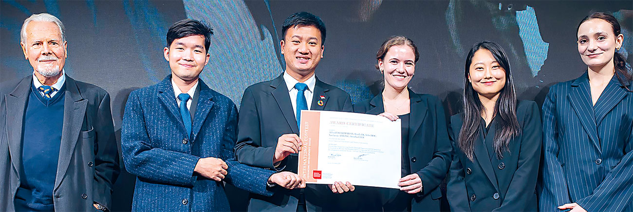 KULIAH DI KORSEL: Tim Asia yang beranggota, dua dari kiri, Bunly Ek, Alland Dharmawan, Nastassja Amling, Seonha Choi, dan Julie Dioc menerima penghargaan pada The Geneva Challenge 2024 di Jenewa Swiss
