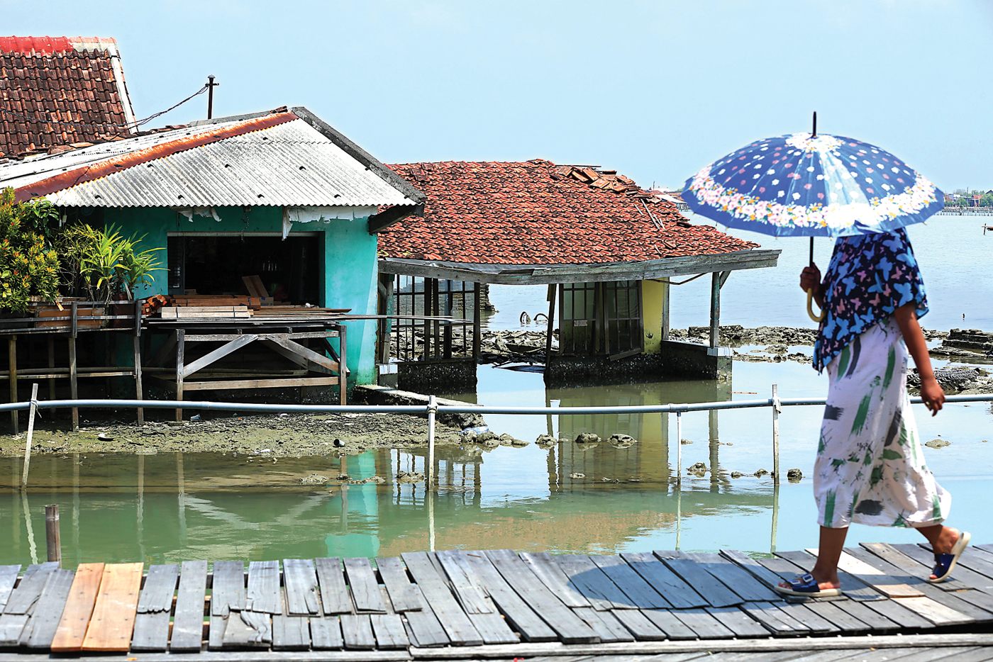 DI depan rumah Rusika di Demak, Jawa Tengah, air laut menggenang sepanjang tahun. Abrasi mengisolasi 170 kepala keluarga di sana.