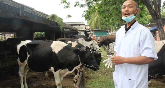 Tujuannya, agar tidak dikibuli jagal. Atribut Yoga hanya masker dan sarung tangan plastik. Begitu tiba di kandang, dia segera menuju ke salah satu sapi yang hendak diperiksa.