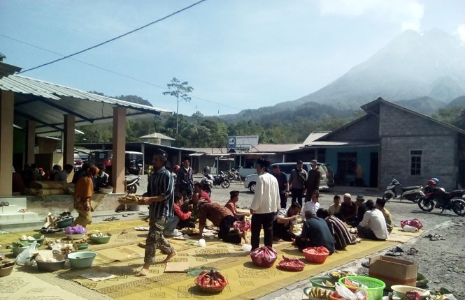 "Ini yang namanya guyub (makan bersama-sama). Tadi malam sudah tahlilan, ini ngirim doa, habis itu makan bersama di masjid. Tapi ada juga yang belum sempat doa. Kembang (bunga) saya masih dikuburkan belum ditabur, terlanjur turun tadi (karena ada letusan)," ucapnya.