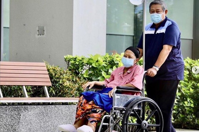 Presiden ke-6 Susilo Bambang Yudhoyono menemani Ani Yudhoyono yang dalam masa penyembuhan dari kanker darah di National University Hospital (NUH) pada 16 Mei.