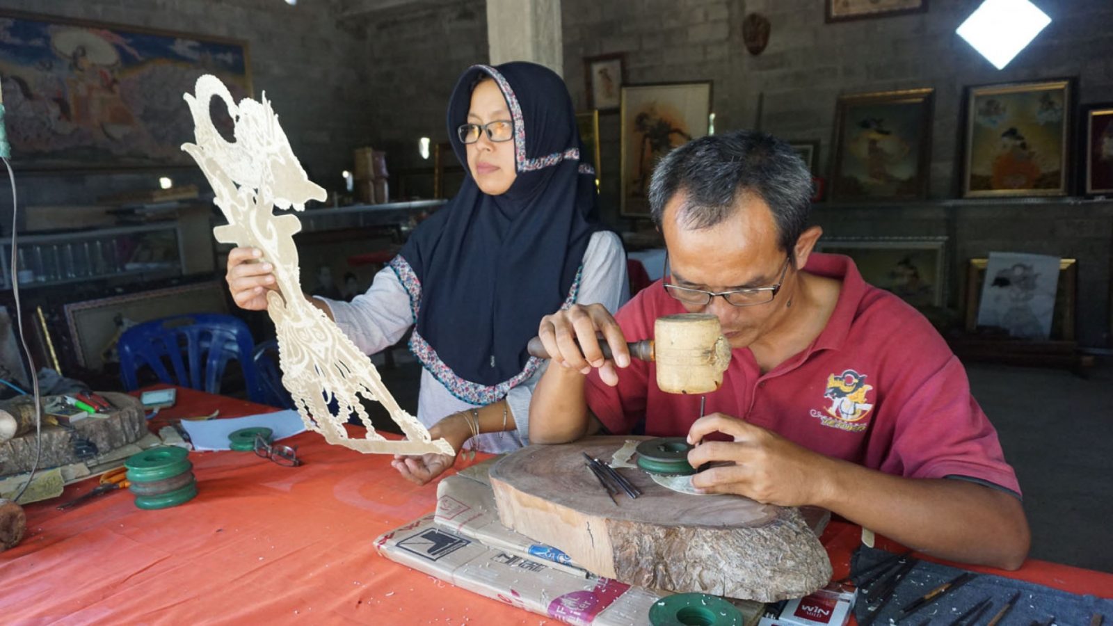 Di lokasi workshop, seorang pria tua terlihat terampil menatah kulit sapi sebagai bahan membuat wayang kulit. Di sampingnya, seorang perempuan paro baya berfokus menyungging atau mewarnai wayang.