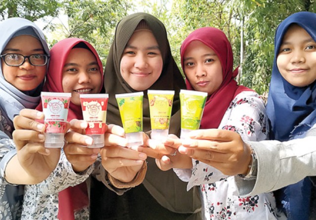 UNTUK KULIT: Dari kiri, Rizki Amalia Arifiani, Kholidatul Fauziyah, Mazhar Ardhina Silmi, Diah Ayu Laraswati, dan Nursanti Arya Pratiwi membawa produk karya mereka. (Edi Susilo/Jawa Pos)