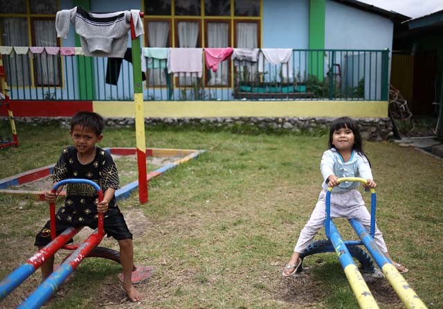 Anak-anak pengungsi asyik bermain di area Kodim Jayawijaya, Wamena, Papua, Jumat (4/10/19). Lebih dari 7000 penduduk Wamena sudah diungsikan ke Jayapura, Manokwari, Biak, dan Timika. (HENDRA EKA/JAWA POS)