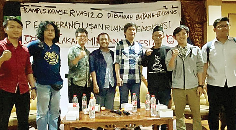 TAK SESUAI RENCANA: Sucipto Hadi Purnomo (empat dari kiri) bersama dosen Fakultas Hukum Universitas Soegijapranata Donny Danardono (dua dari kiri), dosen komunikasi Universitas Diponegoro Triyono Lukmantoro (empat dari kiri), dan perwakilan BEM Unnes di a