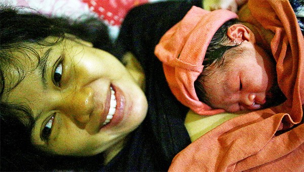 LEGA: Yunnita Setyahati memeluk anaknya setelah persalinan. (MIFTAHULHAYAT/JAWA POS)