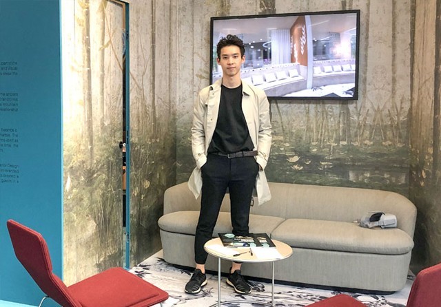 PROYEK MASTERPIECE: Christopher Tanihaha berpose dengan latar Inner Net di Milano Design Week 2019. (Christoper Tanihaha for Jawa Pos)