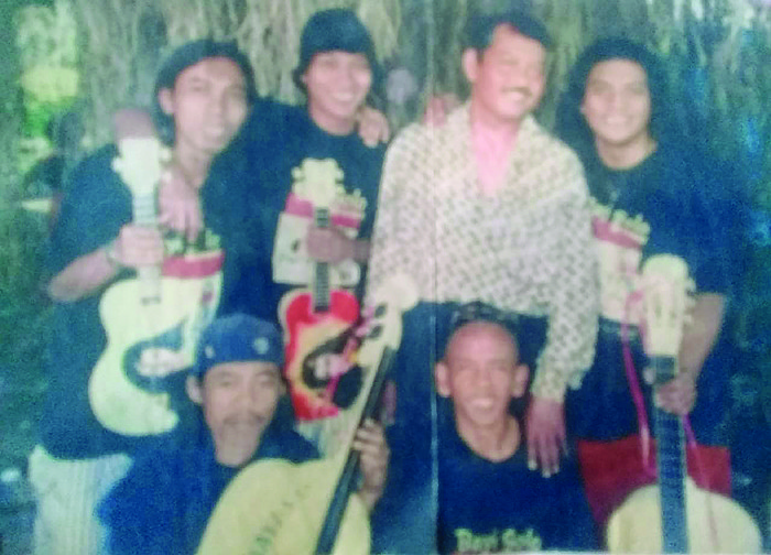 TITIK BALIK: Didi Kempot (berdiri, kanan) bersama kawan-kawan yang membantunya menggarap laug Stasiun Balapan. (HARIYONO FOR JAWA POS)