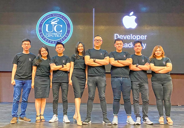 PAKET KOMPLET: Ryan (empat dari kanan) bersama rekan-rekannya di Apple Developer Academy @ UC yang me- ngembangkan aplikasi Plan B. (Yehezkiel for Jawa Pos)