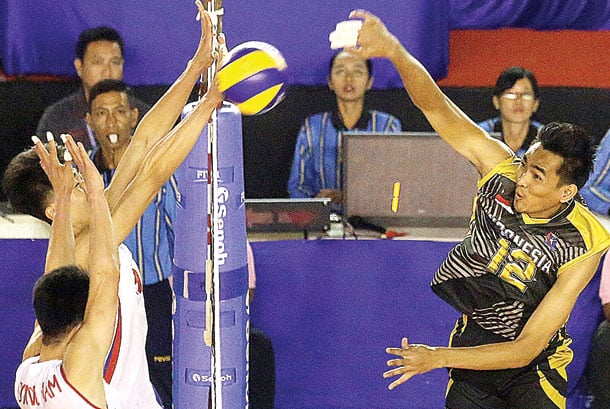 IMPIAN LAMA: Rivan Nurmuli melakukan spike saat menghadapi Korea Utara pada Asian Peace Cup di GOR Pertamina Simprug, Jakarta, tahun lalu. (CHANDRA SATWIKA/DOK.JAWA POS)