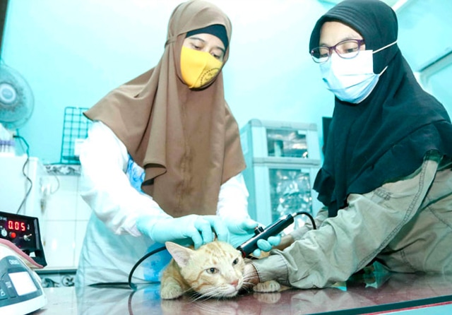 CINTA SATWA: drh Dewa Ayu Putu Arie (kiri) sedang memberikan terapi akunpunktur dan laser kepada kucing milik Yana Heksa selaku ketua Komunitas S2PKD kemarin (6/11). (Alfian Rizal/Jawa Pos)