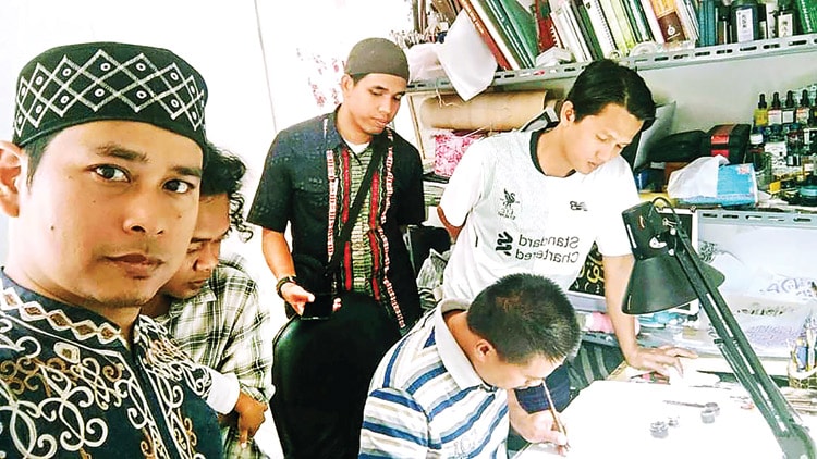 HASIL KERJA KERAS: Husaini bersama rekan-rekannya sedang melihat proses penulisan kaligrafi. (DOKUMENTASI PRIBADI)