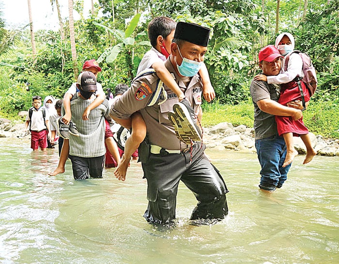 BANTU SESAMA: Bripka Nur Ali Suwandi menggendong siswa yang menyeberangi sungai di Kulon Progo. (BRIPKA NUR ALI FOR JAWA POS)