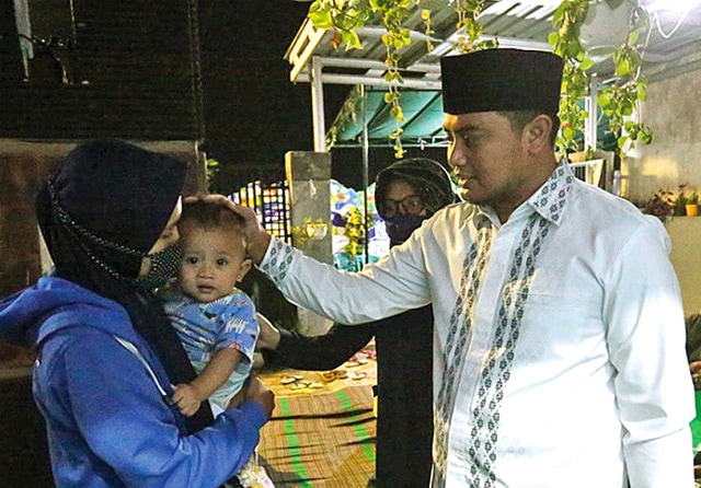 Legislator DPRD Kabupaten Probolinggo Reno Handoyo berbincang dengan Eka Umbriya, istri Sertu Anumerta Misnari, yang sedang menggendong Satria Wira Bakti. (Arif Mashudi/Jawa Pos Radar Bromo)
