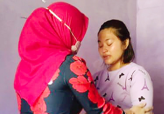 BERI DUKUNGAN MORAL: Moti va tor Ayu Kayla memeluk Sri Nurcah yani, istri Serma Anumerta Ruswanto. (Maya Apriliani/Jawa Pos)