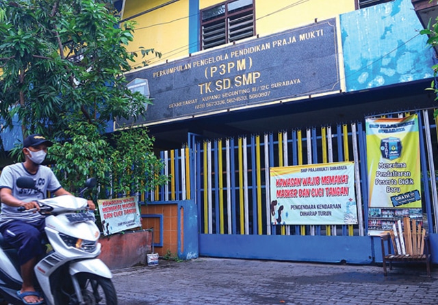 PRIORITAS PENDIDIKAN: Seorang warga melintas di depan gedung SMP Praja Mukti. Sekolah tersebut kalah bersengketa dengan Pemkot Surabaya terkait kepemilikan tanah. (Dimas Maulana/Jawa Pos)