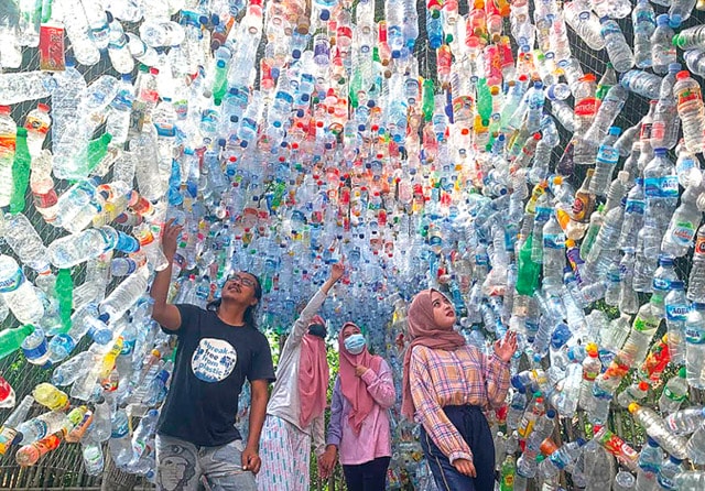 LORONG sepanjang 10 meter itu dipenuhi ribuan botol plastik bekas. Jumlahnya 3.544 buah botol. Bekas wadah minuman kemasan berbagai merek tersebut digantung dan dikaitkan dengan jala di sekelilingnya.