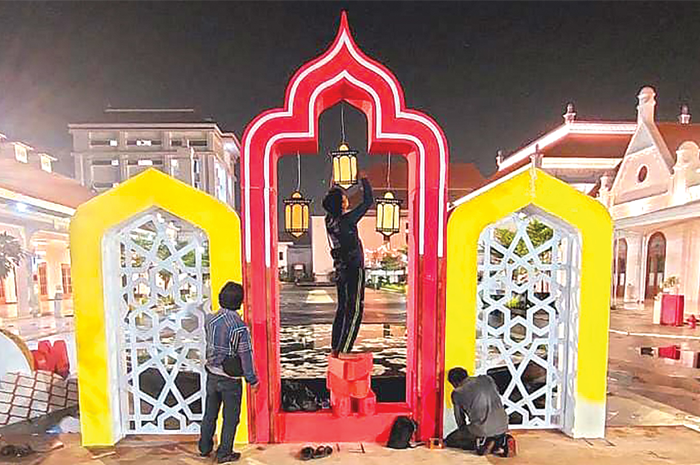 DESAINER PEMKOT: Tim dekorasi DLH memasang miniatur masjid di depan Balai Pemuda untuk menyambut Idul Fitri.