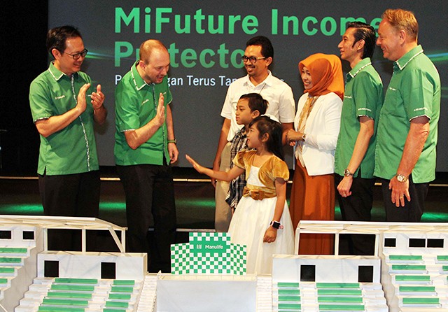 PEDULI NASABAH: Presiden Direktur & CEO Manulife Indonesia Ryan Charland tos dengan anak nasabah saat memperkenalkan solusi perlindungan MiFuture Income Protector (MiFIP) di Jakarta, Kamis (15/8). (Muhamad Ali/Jawa Pos)