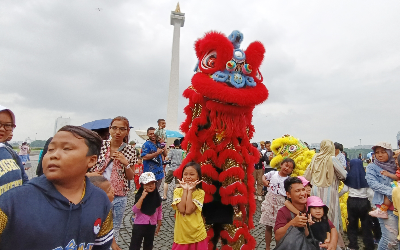 Masyarakat menyaksikan pertunjukan barongsai di area Monumen Nasional (Monas), Jakarta, Selasa (28/01/2025). Atraksi barongsai berlangsung untuk memeriahkan peringatan Tahun Baru Imlek 2576 Kongzili. (Dery Ridwansah/ JawaPos.com)