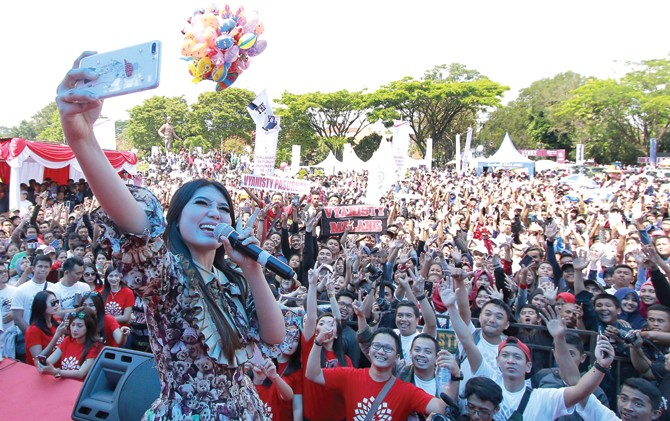 MERIAH: Aksi Via Vallen di panggung car free day (CFD) Jawa Pos Radar Malang kemarin. Penampilan Via merupakan puncak dari gelaran BUMN Hadir untuk Negeri di Malang yang dimotori BRI.