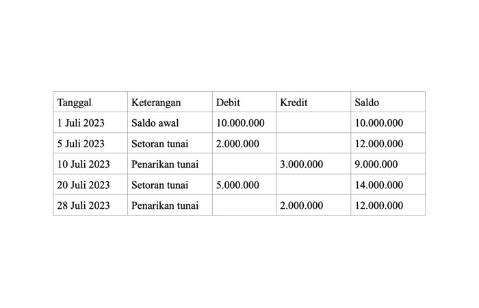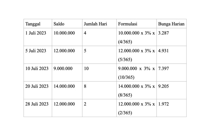 Sebagai contoh, Anda menabung di bank A dengan bunga 3% per tahun di bulan Juli. Catatan tabungan dan saldo Anda di bank tersebut adalah sebagai berikut: