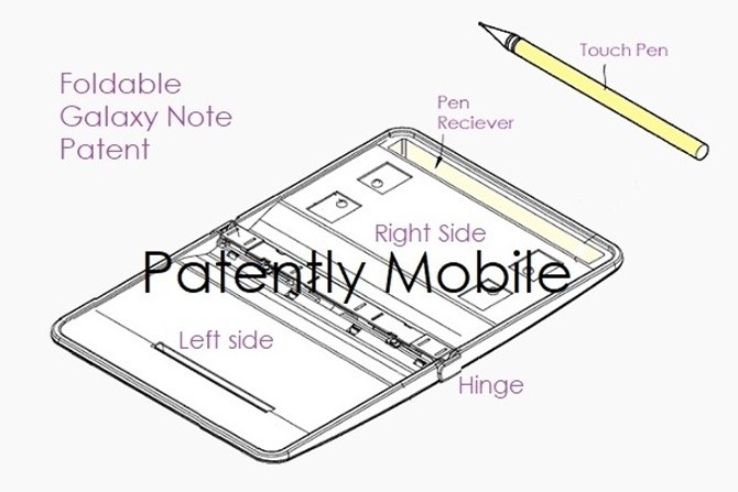 Ilustrasi: Paten Samsung baru terkait ponsel lipat yang memiliki pena stylus seperti di seri Galaxy Note. (PatentlyMobile).