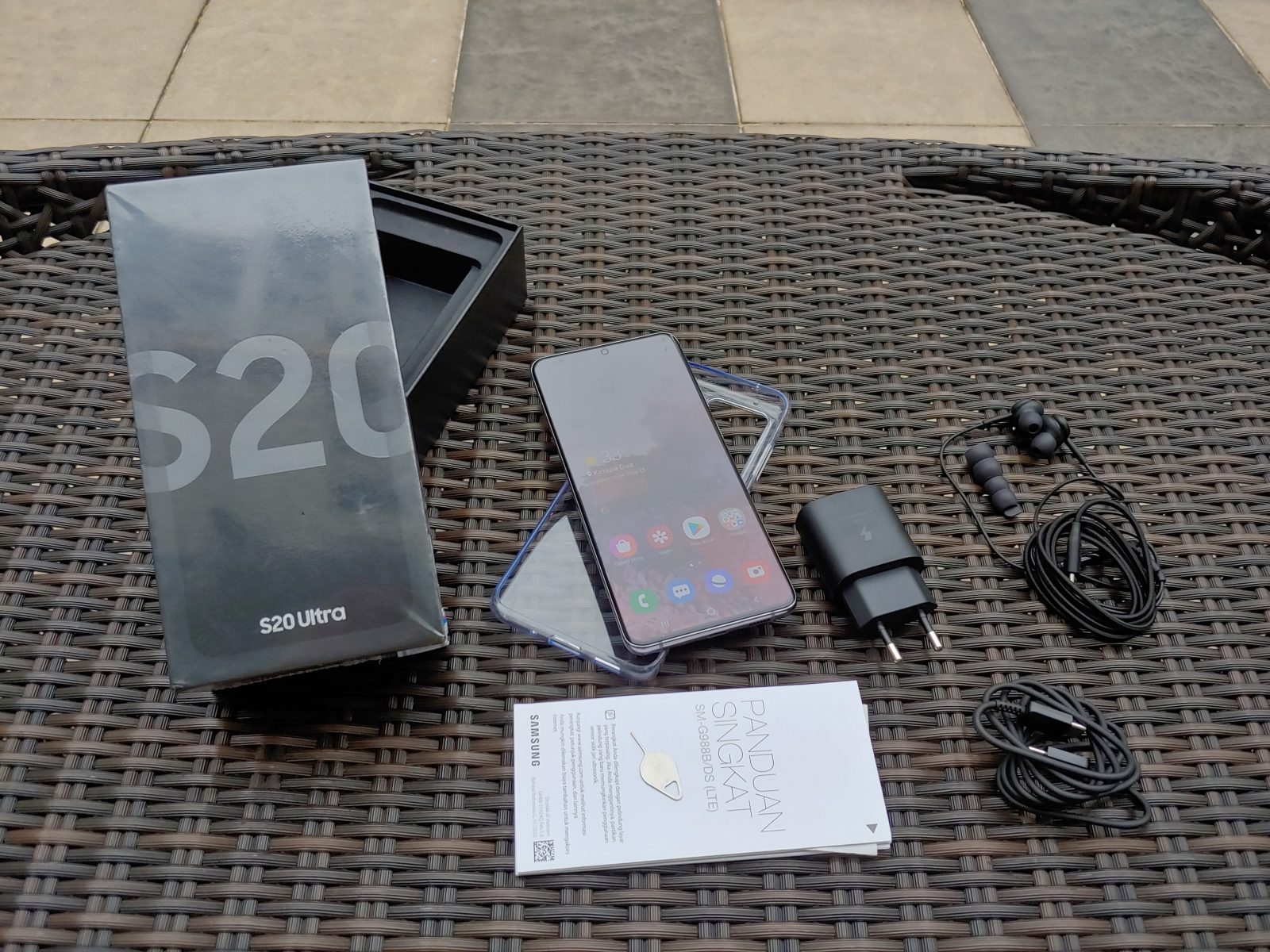 Handset dan paket penjualan Galaxy S20 Ultra. (Rian Alfianto/JawaPos.com)